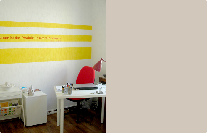 Vom Schreibtisch aus kann der Raum und alle Öffnung überblick werden. Die stabile Wand im Rücken und der Sinnspruch unterstützen die Sitzposition und geben ein Gefühl von Sicherheit am Arbeitsplatz. Das fördert das konzentrierte und erfolgreiche Arbeiten.