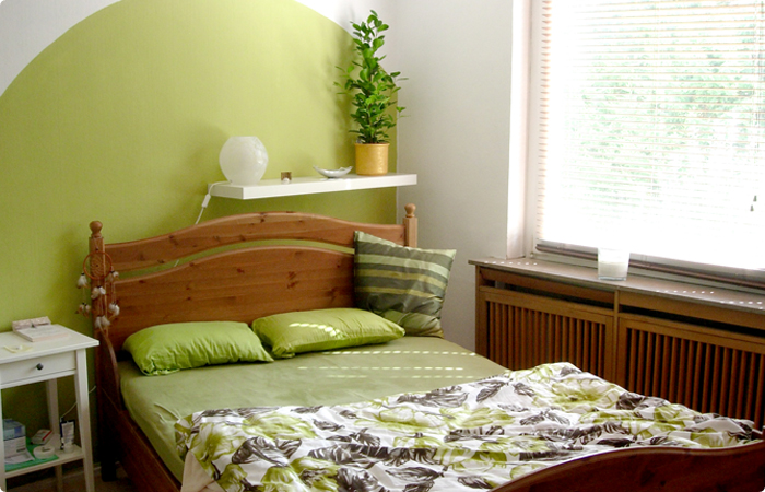 Das stabile Kopfteil des Bettes und die grüne Farbe an der Wand bringen Ruhe zu Entspannung für den Schlaf.