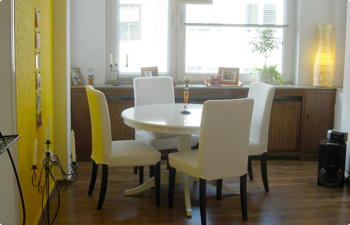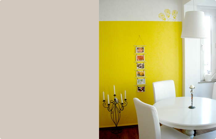 Das Wohnzimmer teilt sich auf in Essbereich und Sitzecke. Die Abgrenzung der Bereiche wurde durch die farbliche Zuordnung unterstützt; Erde für den Essecke und Metall für die Sitzbereich.