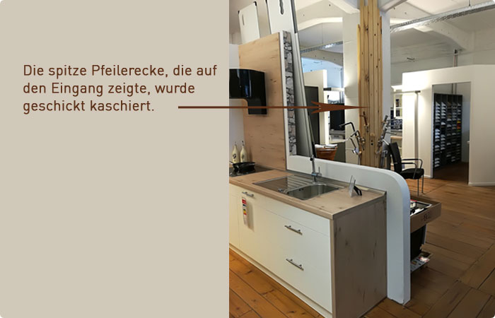 Es gab aber auch kleine simple Veränderungen. So wurde durch das einfache abrunden einer halbhohen Wand gleich im Eingangsbereich, ein unterbewusst störender Faktor schnell beseitigt. Spitze Ecken von Pfeilern wurden verkleidet, um den Besucher vor „spitzen Energie-Pfeilen“ zu schützen. Ein großes Ausstellungsregal wurde mit runden Böden um einen Pfeiler gestaltet. Ein wahrer Eye-Cather für das Schaufenster.