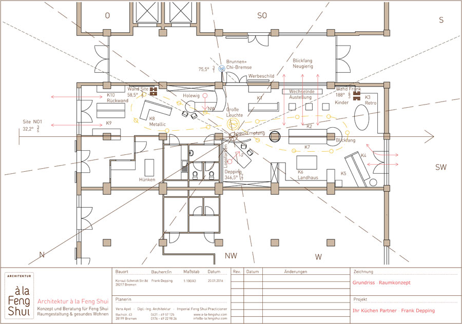 Die festen Arbeitsplätze wurden neu definiert und an die Personen angepasst. So hat Herr Depping als Chef seine Position im Nordwesten erhalten, in einer verdeckten Nische, wo er ungestört arbeiten kann. Der NW ist im Feng Shui die Position für Führung, Entscheidung und Struktur – also Chef Sache.