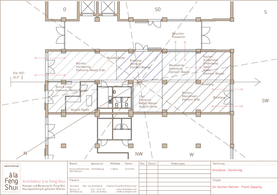 Als erstes habe ich den Grundriss in Zonierungen aufgeteilt. So entstanden sieben Bereich mit unterschiedlichen Energiequalitäten, je nach Himmelsrichtung und Lage im Raum. Auf dieser Basis konnte ich entscheiden wo im Raum, welche Küchenart am besten platziert wird, um den besten Absatz zu erzielen. In einem Sektor mit einer schwachen oder ungünstigen Energie sind hochwertige und gut laufende Produkt nicht gut aufgestellt. Sie könnten hier sogar zu Ladenhütern werden. Im Feng Shui versuchen wir immer die vorhandenen Energien für unsere Zwecke zu nutzen, um möglichst viel Rückenwind in unseren Projekten zu haben. Das macht die Arbeit leichter und angenehmer.