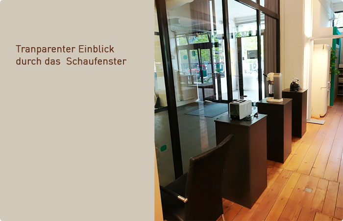 Der Außen-Innen-Bezug stellt in einer Ausstellung immer einen zentralen Punkt da. Die Kunden müssen schon von außen erkennen können, was sie im innen erwartet. Ihre Neugierde muss geweckt werden, damit sie den Laden gerne betreten wollen. So habe ich hier in den beiden Schaufenstern eine „lockere“ Raumgestaltung eingeplant, die das Hineinsehen in den Raum nicht behindert, sondern Lust auf mehr macht.