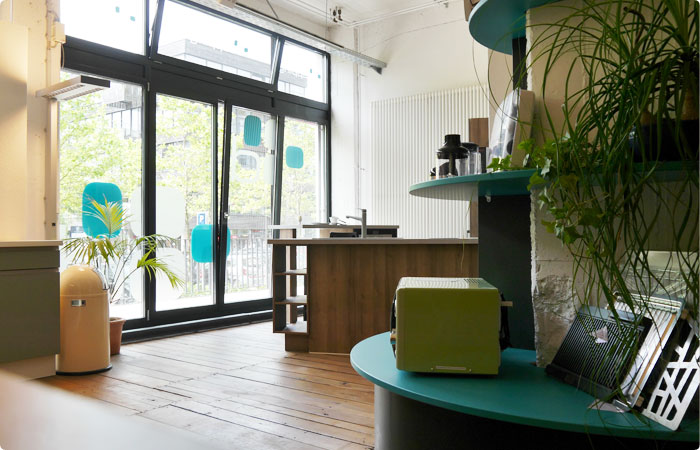 Die Schaufenster erhielten Folierungen mit dem neuen CI und die Farben wurden in der Raumgestaltung aufgenommen. So finden sich die Farben Türkis und Schlammgrau im gesamten Design wieder.