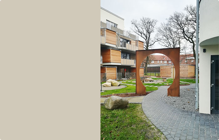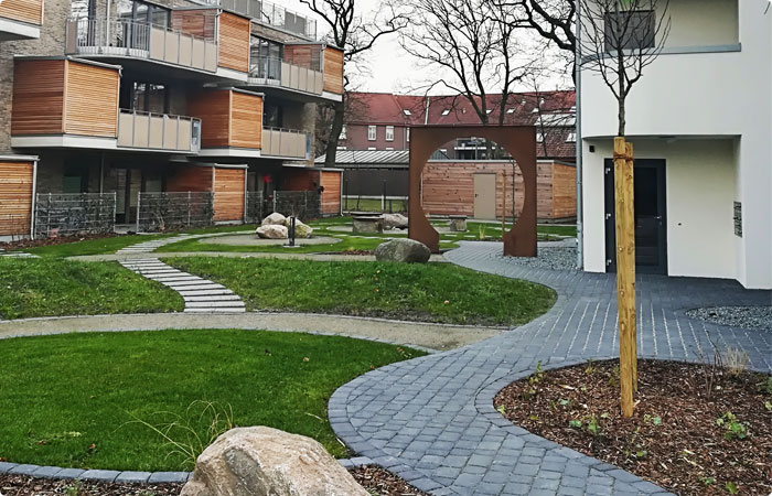 Das dadurch enstandene Quartier wurde besonders mit den Außenanlagen und seinen Details wie Mondtore, Wasserspiel und Blumenwiesen zu einem von den Bewohnern geschätzter Lebensraum umgesetzt. Mein Dank an Frau Apel für das präzise ausgearbeiteten Feng Shui Konzepts.“