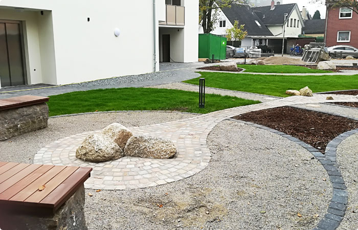 Nachdem die drei Häuser auf dem Grundstück fertig gebaut waren, ging es an die detaillierte Außenraumgestaltung. Es war mir wichtig, dass die Anlage langfristig gut erhalten bleibt und der äußere Gemeinschafstraum genutzt und gepflegt wird. Feng Shui findet zu 70% im Außen und zu 30% im Innenraum statt. Auf dieser Grundlage erhält die Gestaltung der Umgebung eine neue Gewichtung.