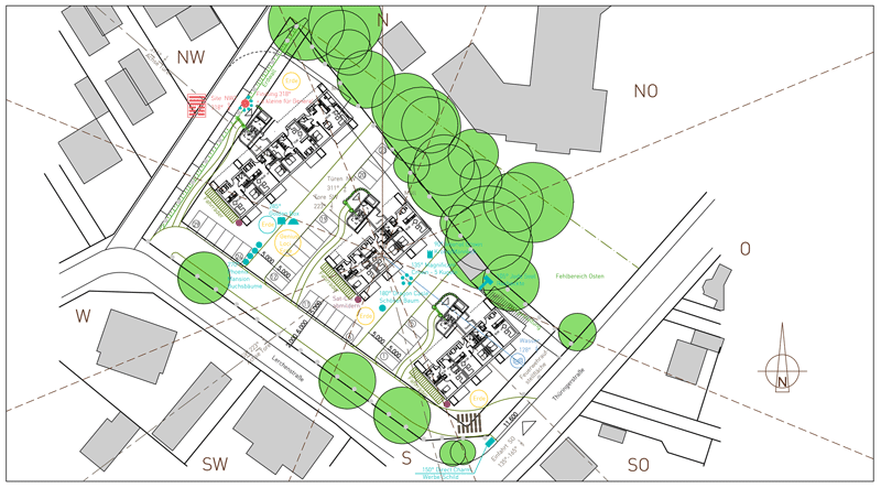 Für mich begann das Projekt auf der grünen Wiese. Bei unserem ersten Besuch des Grundstückes stand ich vor einer schönen bunten Sommerwiese. Ein herrlicher Anblick. Mir war sofort klar, dass diese Naturatmosphäre nach dem Bau wieder hergestellt werden sollte in der Außenraumgestaltung der Wohnanlage.