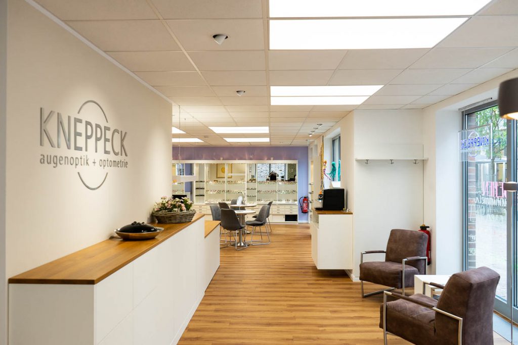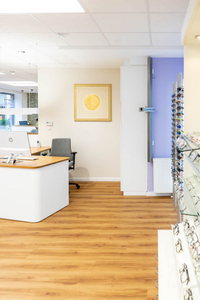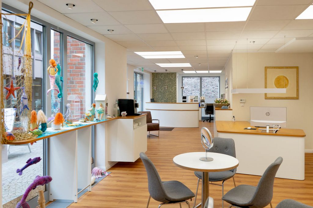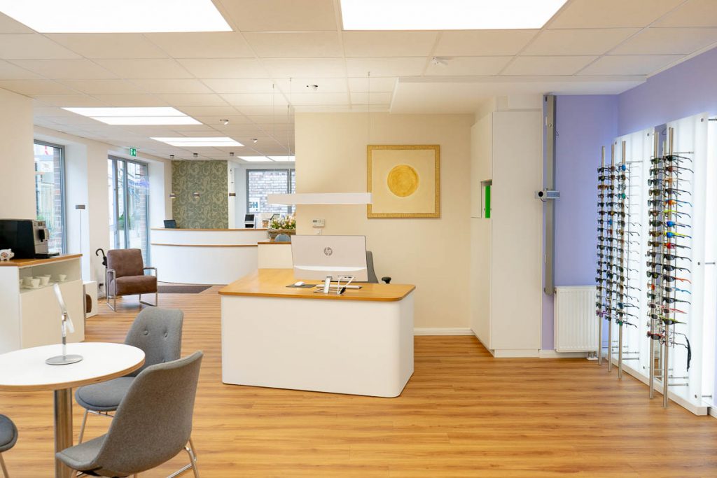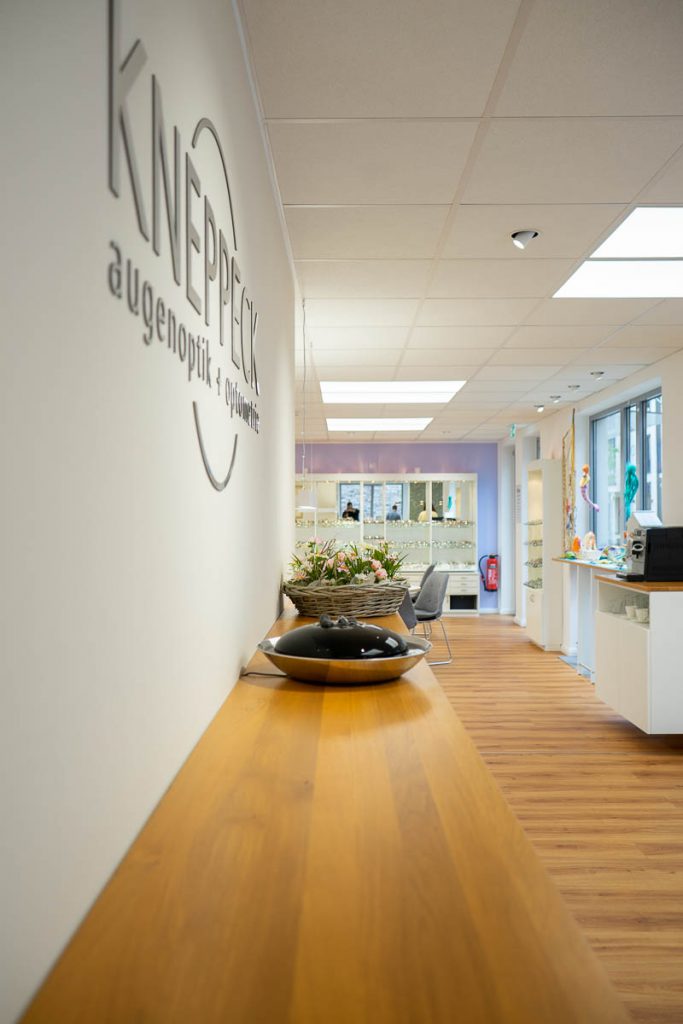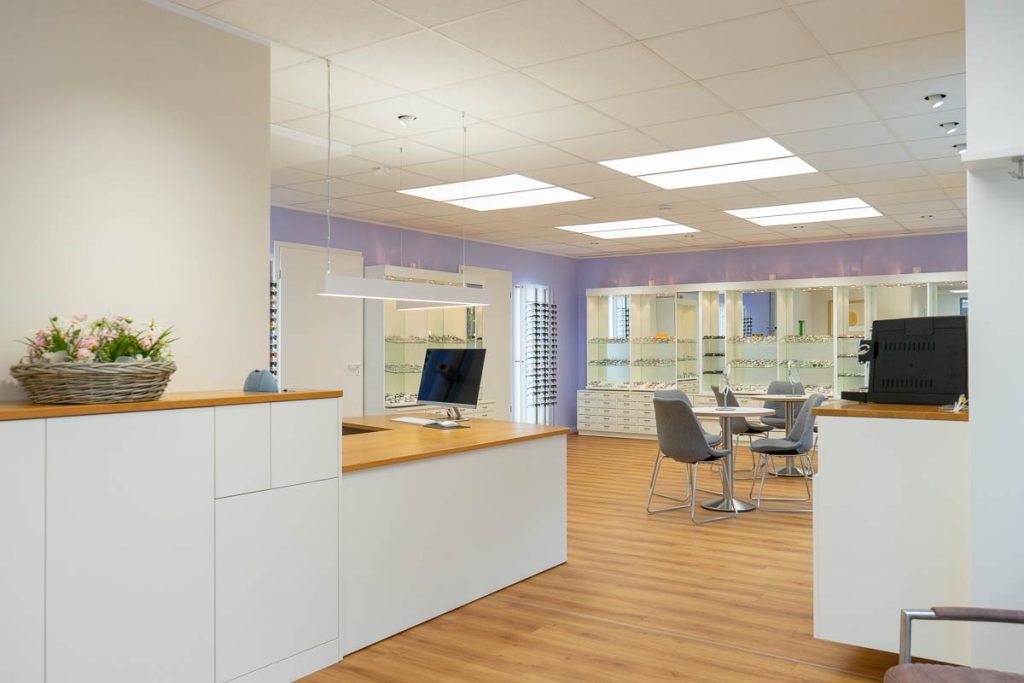 Durch die freundlichen hellen Farben im Zusammenspiel mit dem klar definierten Beleuchtungskonzept entsteht eine Raumqualität, die jedem Brillenträger schmeichelt.