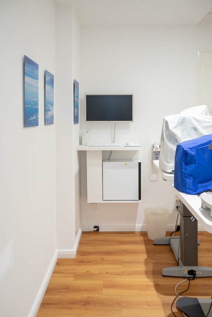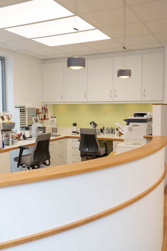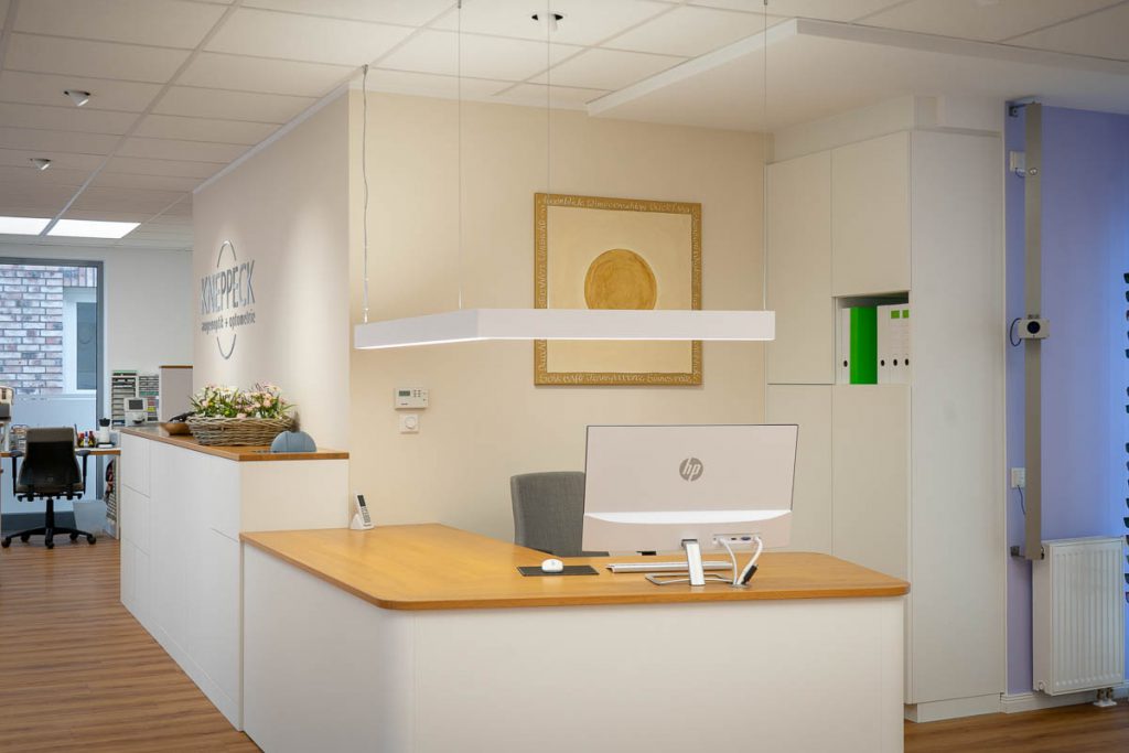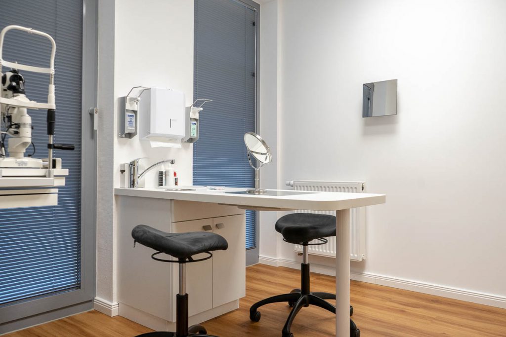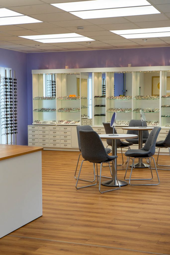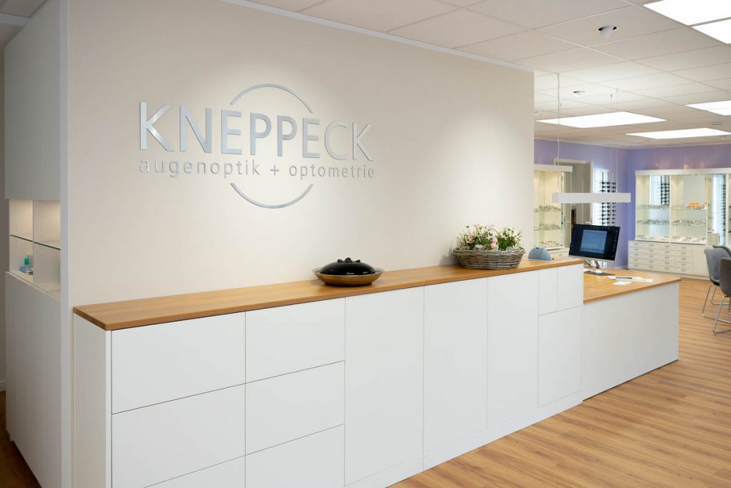 Durch die freundlichen hellen Farben im Zusammenspiel mit dem klar definierten Beleuchtungskonzept entsteht eine Raumqualität, die jedem Brillenträger schmeichelt.