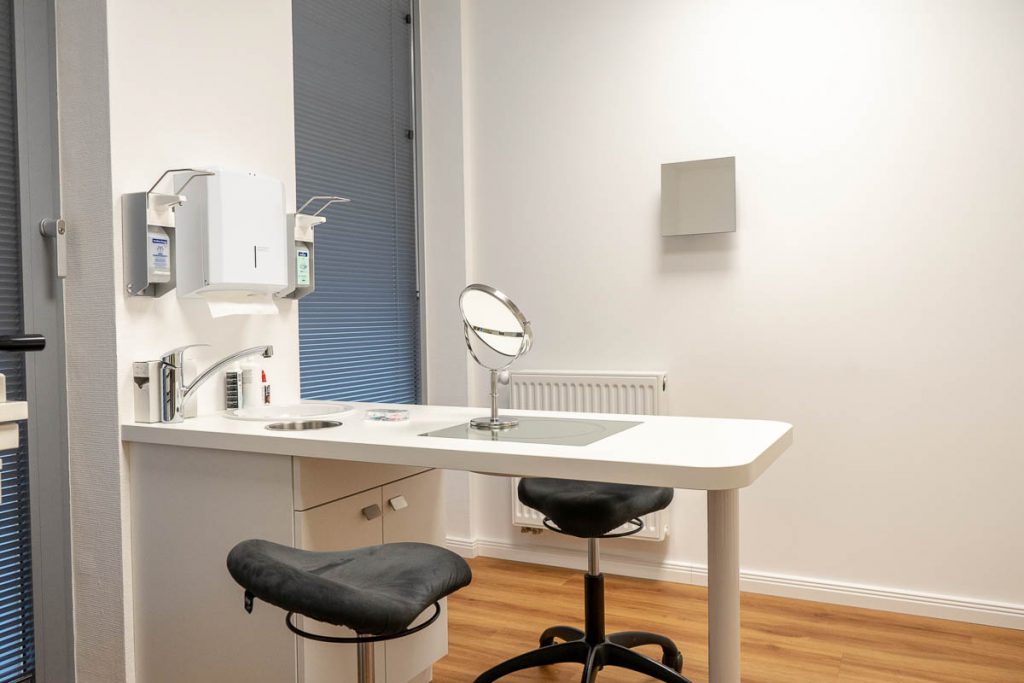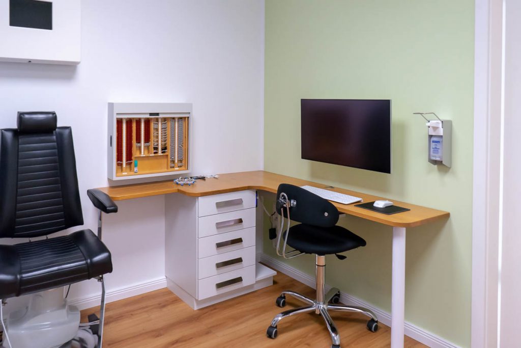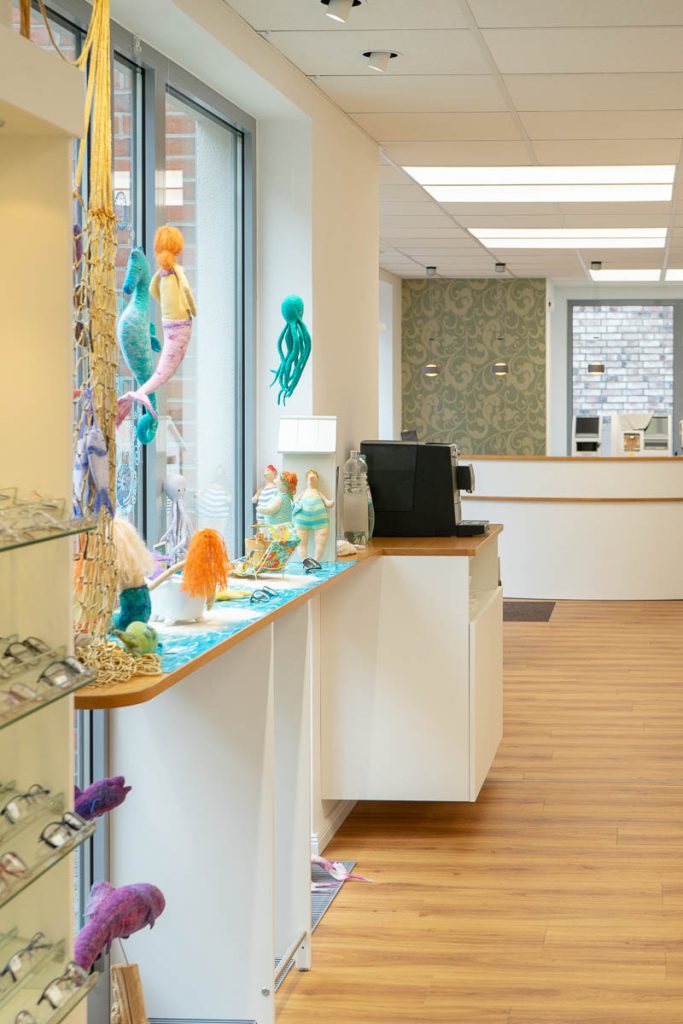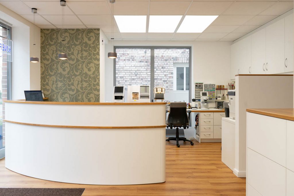 Der Kunde kann beim Betreten gleich die Funktionalität und Wertigkeit des Unternehmens erkennen, in dem er die Werkstatt hinter dem Kassenbereich einsehen kann. Hier werden vor Ort die Brillen angepasst mit der feinen Handmotorik eines Optikers.