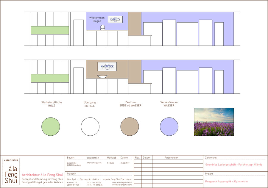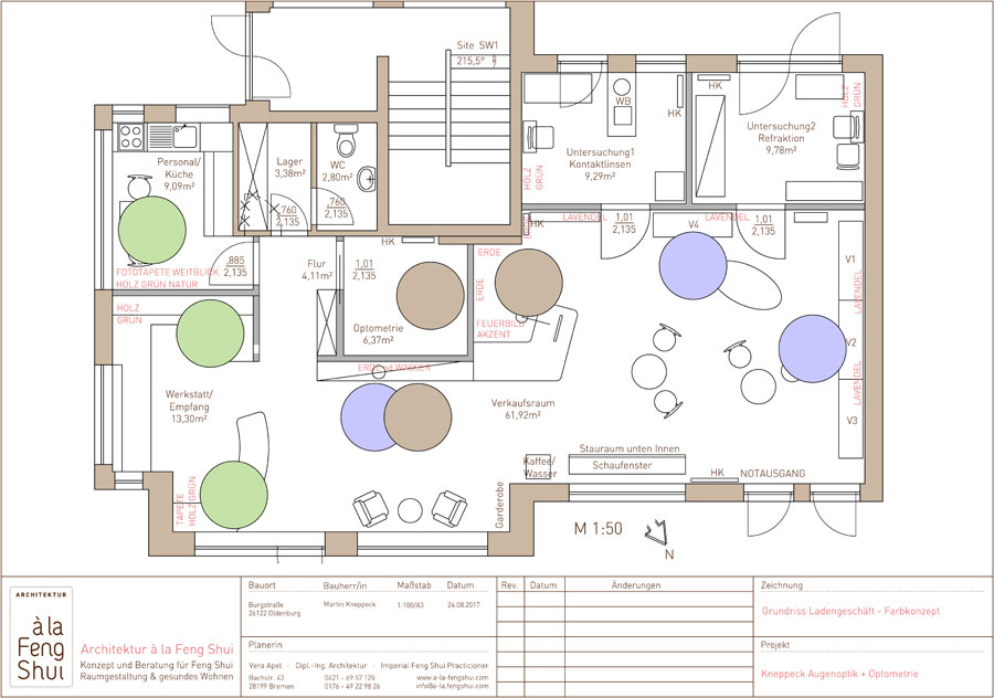 Herausforderung war, das einige Räume in Ihrer Größe und Lage nicht anders zu platzieren waren. Die möglichen Gestlatungsspielräume wurden nach Feng Shui gut genutzt – es ist ein guter „Fluß“ im Laden!