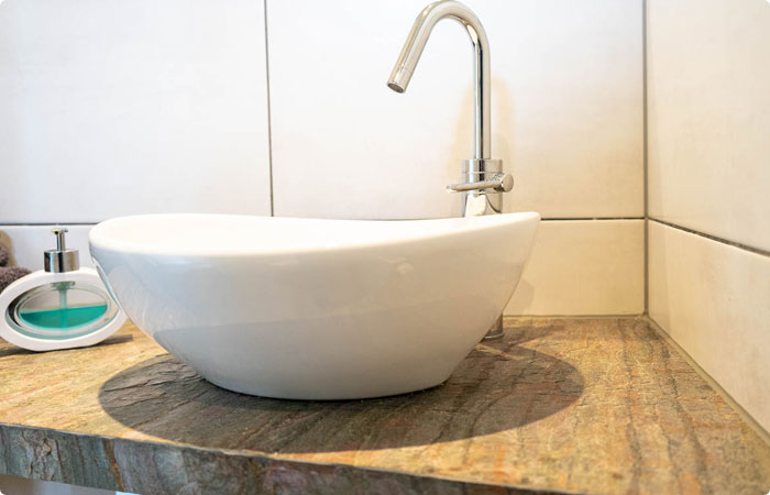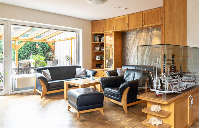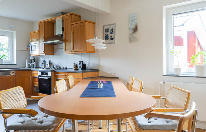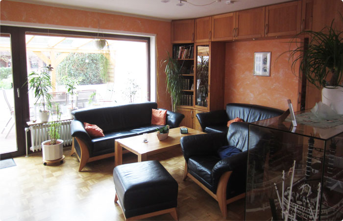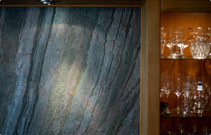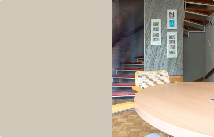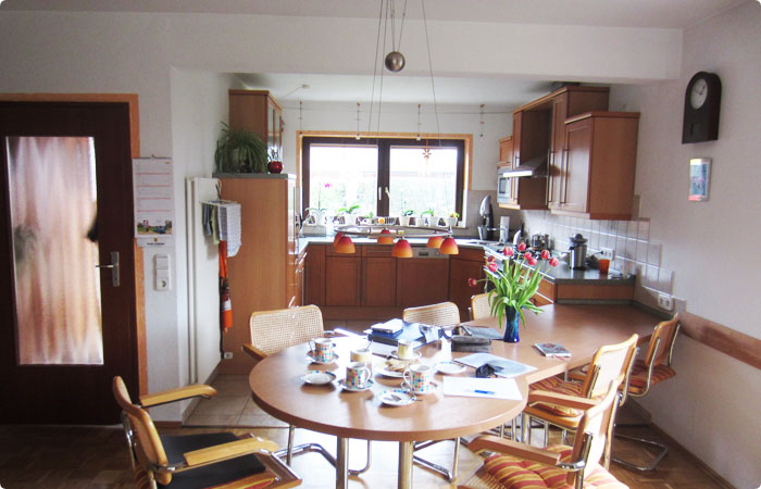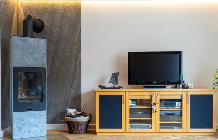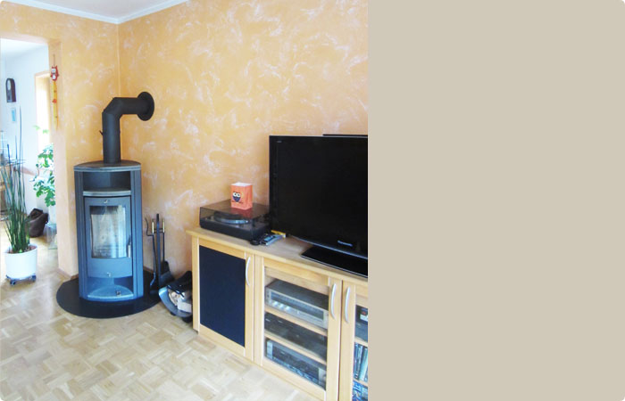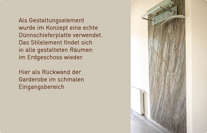 Es wurde dafür eine zurückhaltende Wandfarbe gewählt, die im Lehmputz verfahren aufgebracht wurde. Sie bildet den Hintergrund für die Buchenmöbel und das Eichenparkett. Als Blickfang wurden Dünnschieferplatten an ausgewählte Stellen im Raum an den Wänden positioniert. Sie nehmen die Farben des Raumes auf und bilden einen angenehmen Kontrast zu der dezenten Wandfarbe.