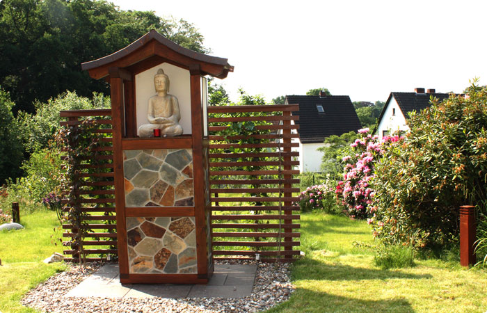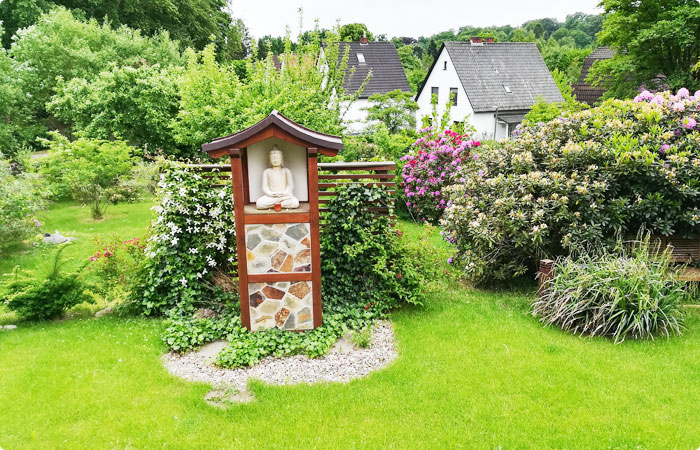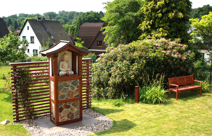 Im Feng Shui bedeutet diese Landschaftsform, dass die Energie sich nicht auf dem Grundstück halten. Das Chi fließt einfach den Hügel hinab und vom Grundstück. Die erste Maßnahme war also eine Gartenplanung zu erstellen, die das Chi hält und somit dem Haus Sicherheit und Stabilität vermittelt. Hierfür wurde eine Terrassierung angelegt, die im Bereich des rückwärtigen Hauses immer eine feste Bepflanzung vorzieht. Mittig hinter dem Haus wurde zusätzlich ein ca. 2,50m hohes Häuschen für einen Buddha errichtet, der dem Gebäude zusätzlich Stabilität im Rücken verleiht.
