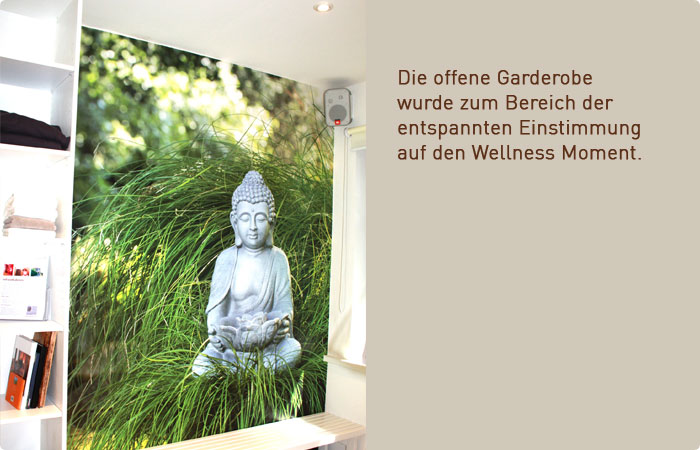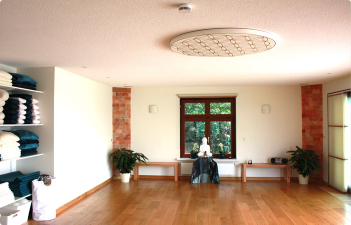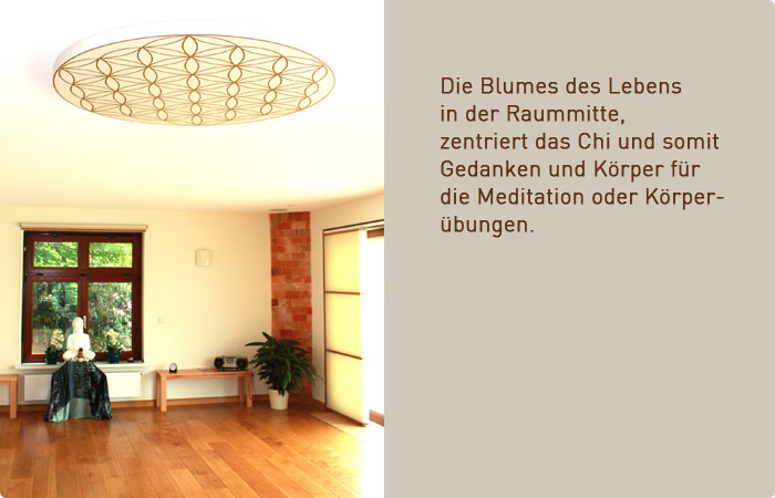 Im Innenraum wurde als erstes ein offener und einladender Empfangsbereich eingerichtet. Direkt im Anschluss in Richtung Garten befindet sich der großzügig geschnittene Kursraum. Über die ganze Hausbreite entstand ein heller freundlicher Raum mit einer großen Fensterfront auf die neuangelegte Gartenterrasse. Von hier kann den Ausblick genießen in den Garten mit dem Buddha Häuschen aus Holz, dass den gleichen Baustil erhalten hat wie die Rückseite des Hauses. Um die Energie im Raum zu halten wurde gegenüber der Tür eine großflächige Folierung an das Fenster gebracht mit dem Logo der Villa Katharina. Zusätzlich wurde im Zentrum an der Decke eine große Abbildung der Blume des Lebens angebracht. Diese wunderschöne goldene Abbildung zentriert den Raum, in dem sie das Chi bindet und hält.