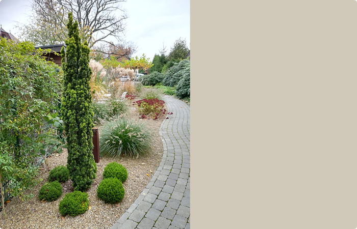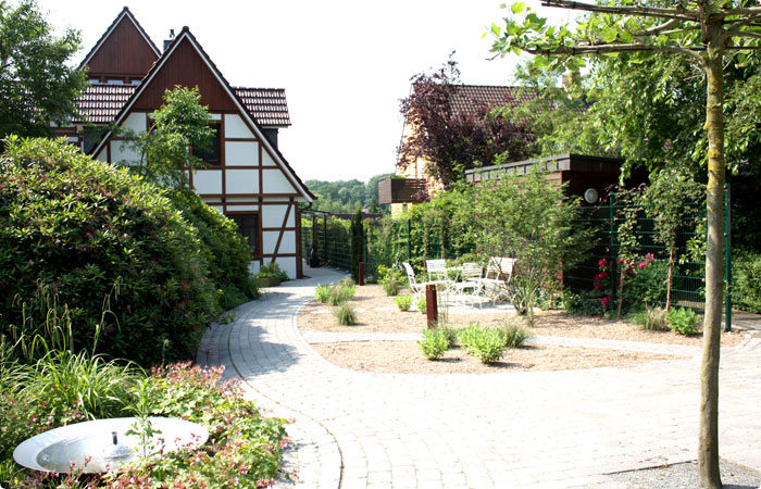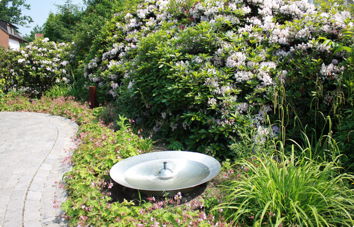 Vor dem Haus haben wir die Zuwegung leicht geschwungen angelegt. So fließt das Chi leicht und entspannt zur Haustür. Im Vorgarten wurden noch einige weitere Feng Shui Aspekte umgesetzt, wie zum Beispiel eine große Wasserschale als Brunnen, eingemessen auf ein aktives Kua, für einen kontinuierlichen Geldfluss im Haus. Damit die Energie nicht an der Haustür vorbei fließt wurde eine Chi-Bremse aufgestellt in Form von üppig bepflanzten Blumenkübeln, die saisonal dekoriert werden.