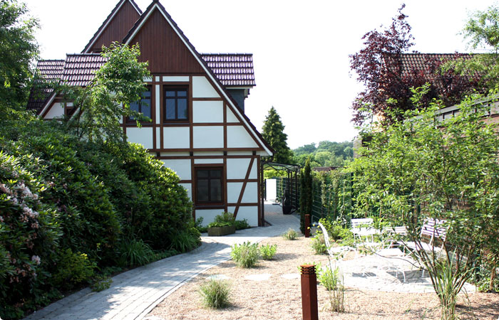 Das schmale lange Flurstück, auf dem das Haus fast mittig positioniert ist, fällt hinter dem Gebäude stark ab und war zunächst komplett offengehalten, ohne große Bepflanzung.