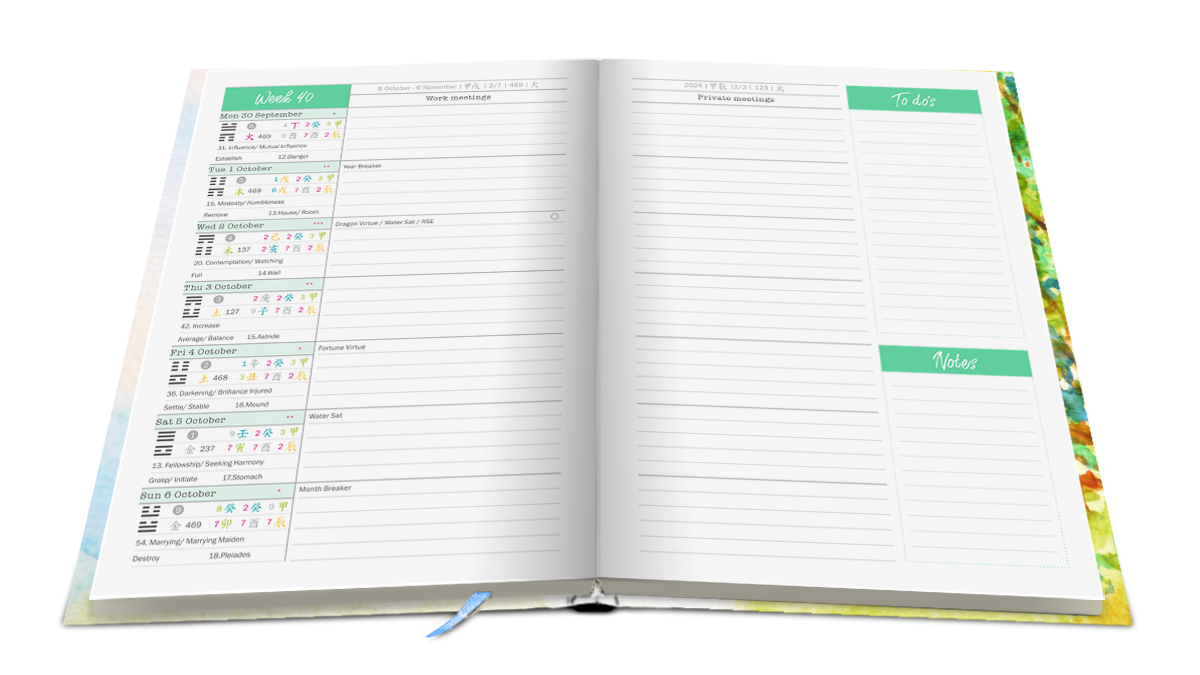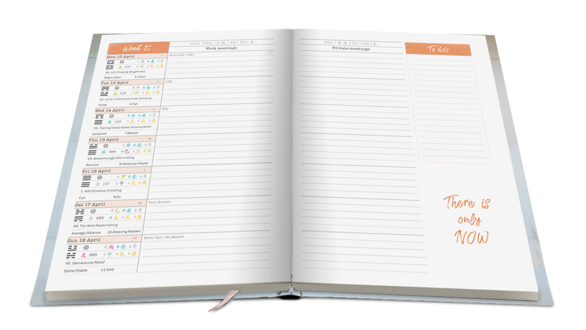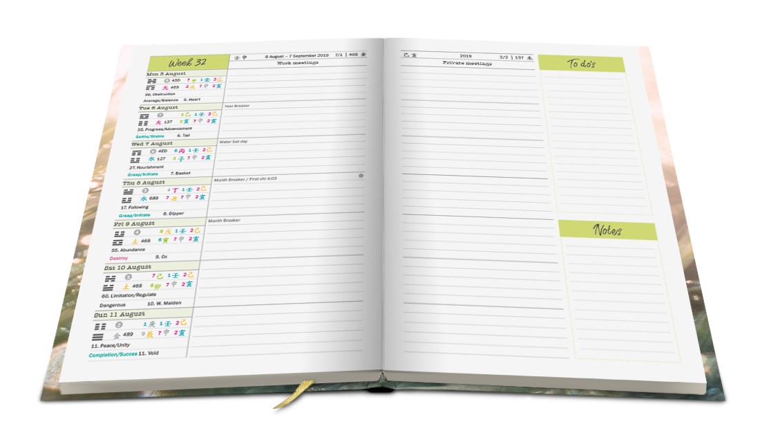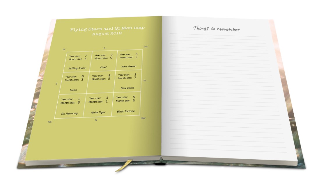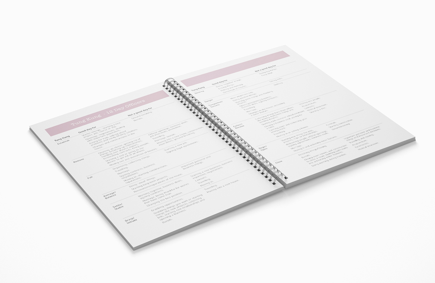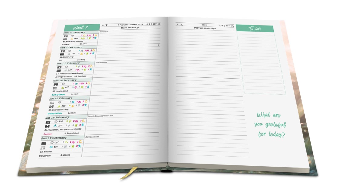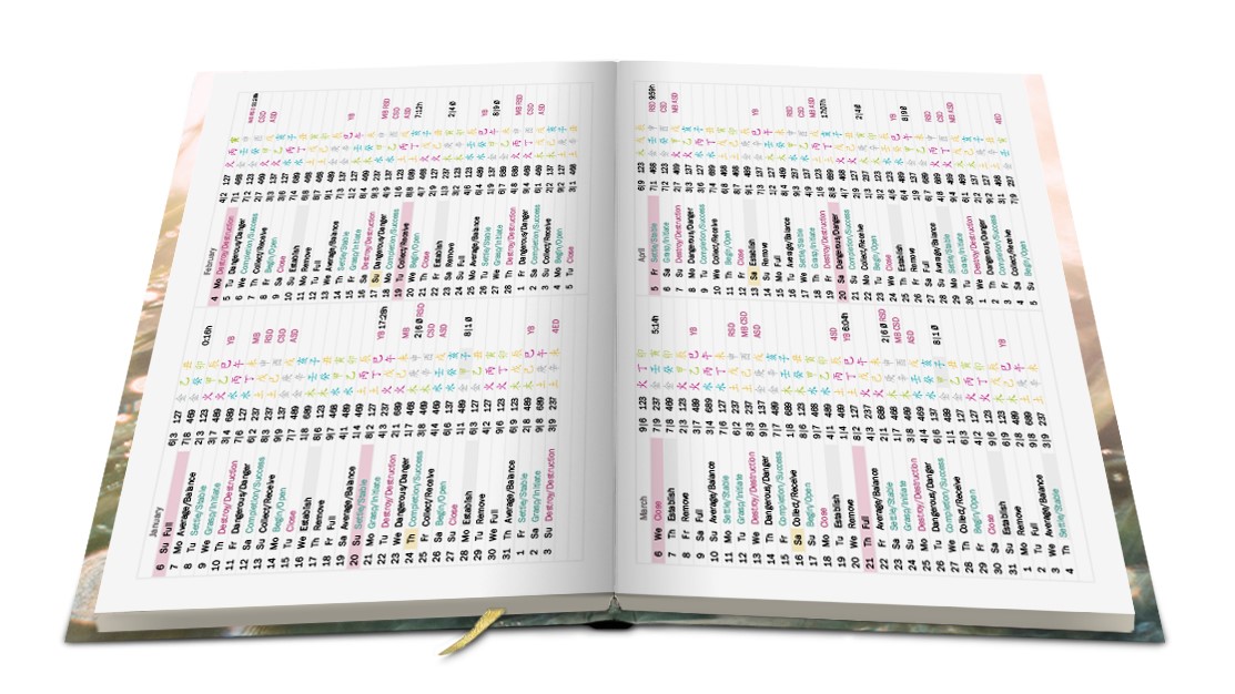 Es gibt einen Wochenüberblick, mit den täglichen Energiequalitäten und ausreichend Platz für Business- und Privattermine. Für jeden Monat ist eine Einführungsseite mit Fotos zum Genießen und inspirierenden Zitaten, sowie der monatlichen Energiequalitäten enthalten. Am Ende gibt es viele zusätzliche Infos, wie unter anderen eine Übersicht der Monate mit allen Date Selection Infos auf einen Blick, eine Zeittafel, alle wichtigen Chi Change Tage und Zeiten…und vieles mehr.