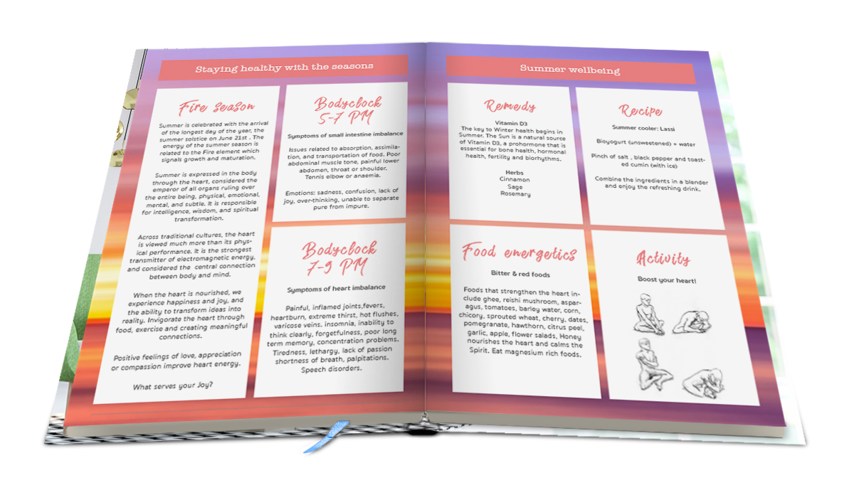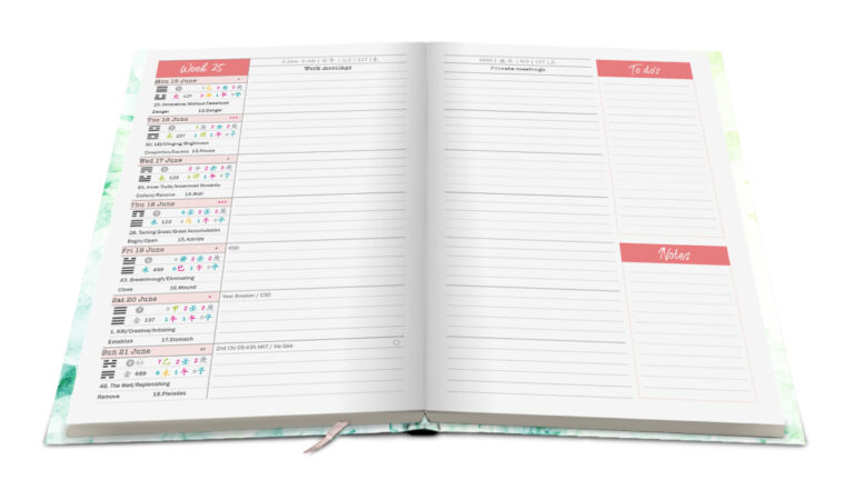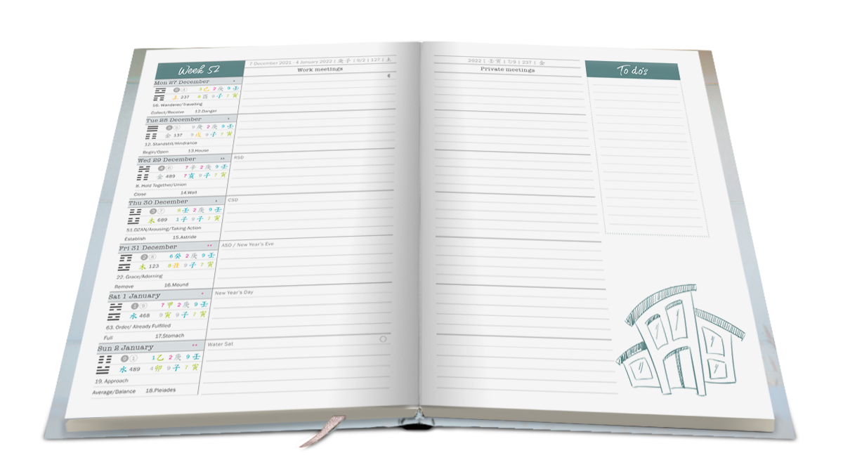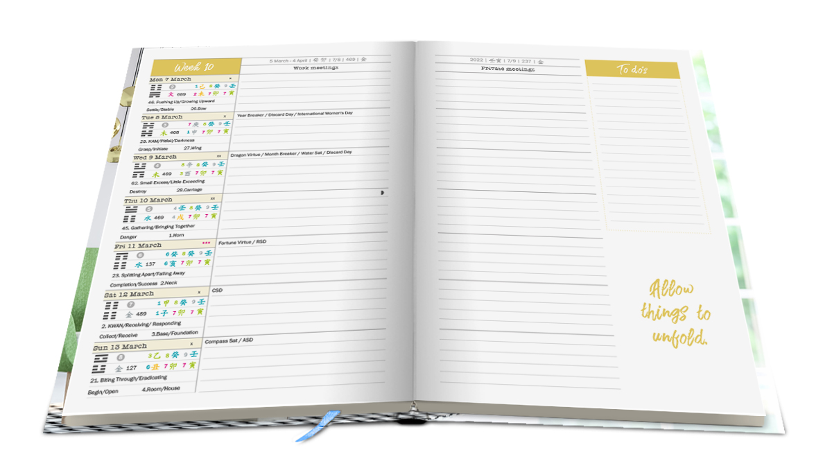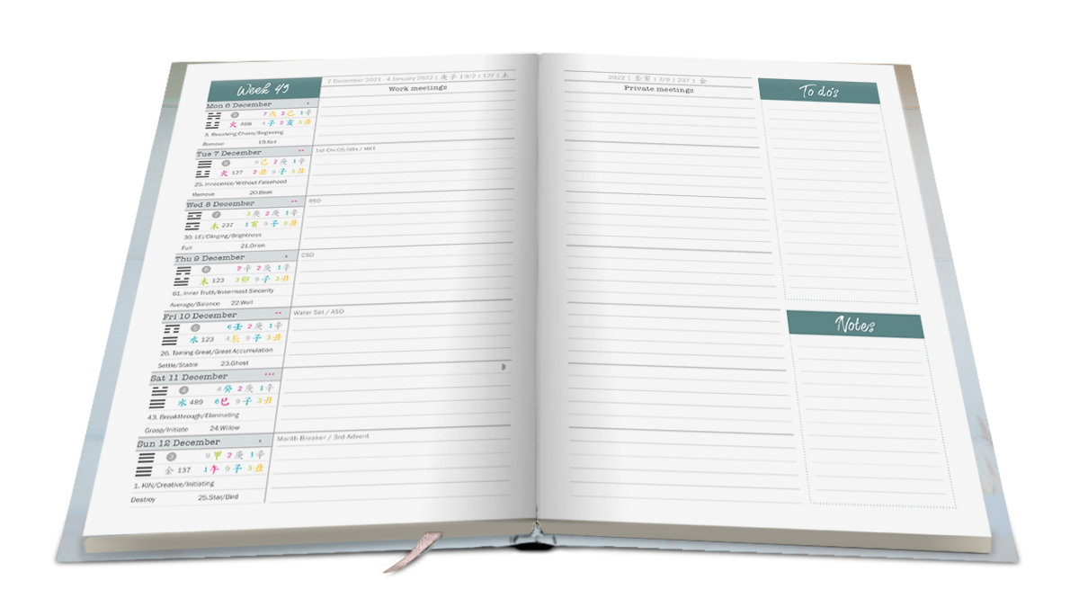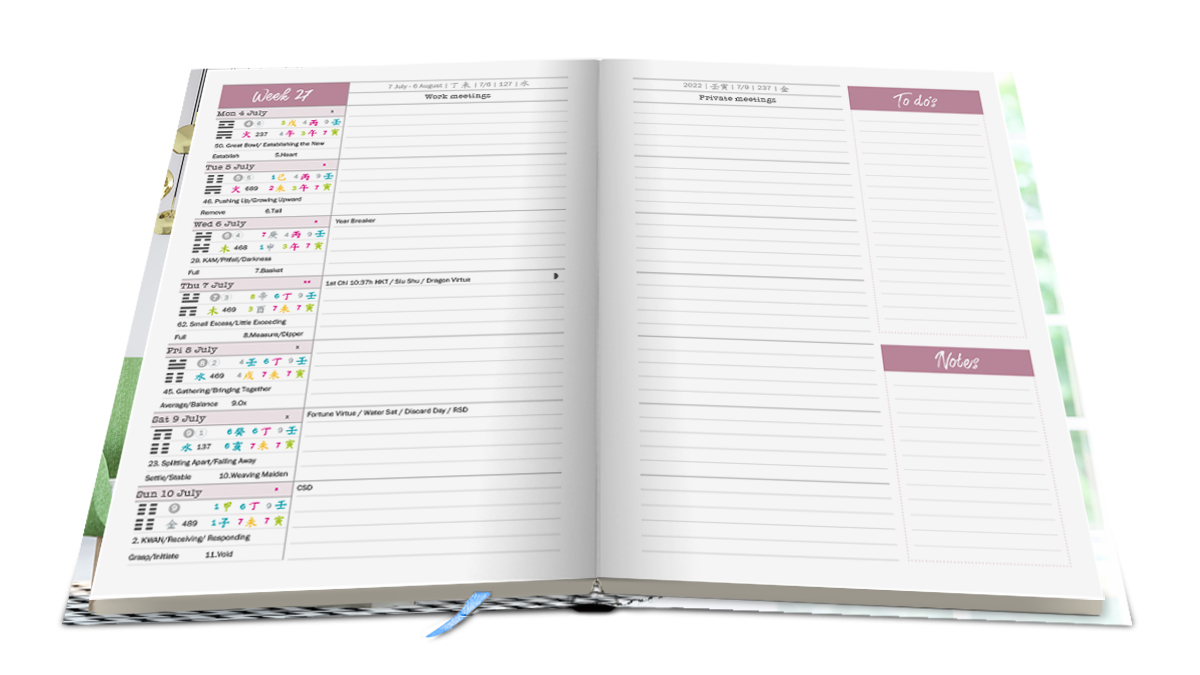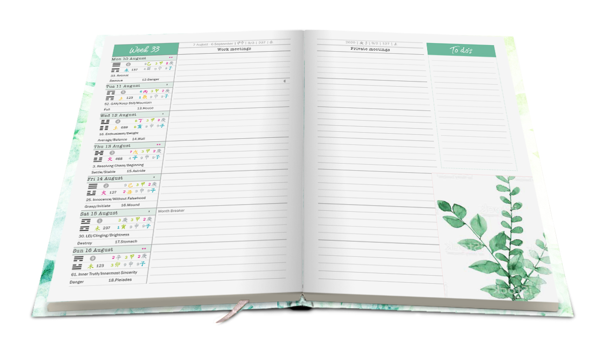 Es gibt einen Wochenüberblick, mit den täglichen Energiequalitäten und ausreichend Platz für Business- und Privattermine. Für jeden Monat ist eine Einführungsseite mit Fotos zum Genießen und inspirierenden Zitaten, sowie der monatlichen Energiequalitäten enthalten. Am Ende gibt es viele zusätzliche Infos, wie unter anderen eine Übersicht der Monate mit allen Date Selection Infos auf einen Blick, eine Zeittafel, alle wichtigen Chi Change Tage und Zeiten…und vieles mehr.