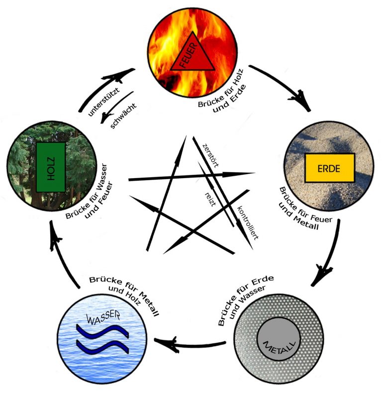 Die Fünf Elemente repräsentieren die Fünf Wandlungsphasen Holz – Feuer – Erde – Metall – Wasser. Alle Elemente stehen in Zusammenhang zu einander und jedem werden bestimmte Eigenschaften zu geordnet, wie unter anderem Farbe, Form, Material, Himmelsrichtung, Jahres- und Tageszeit, Körperteile und Organe.